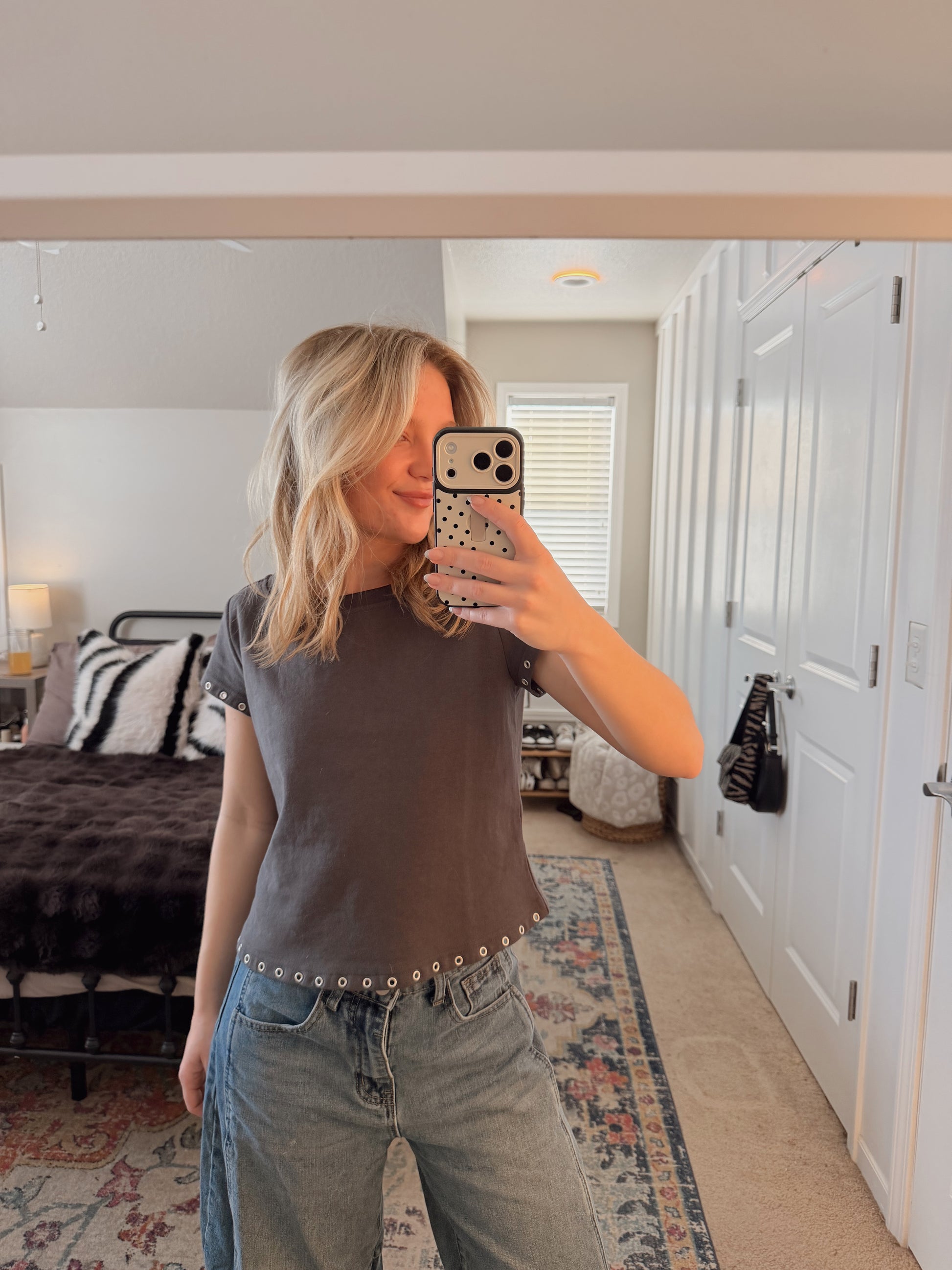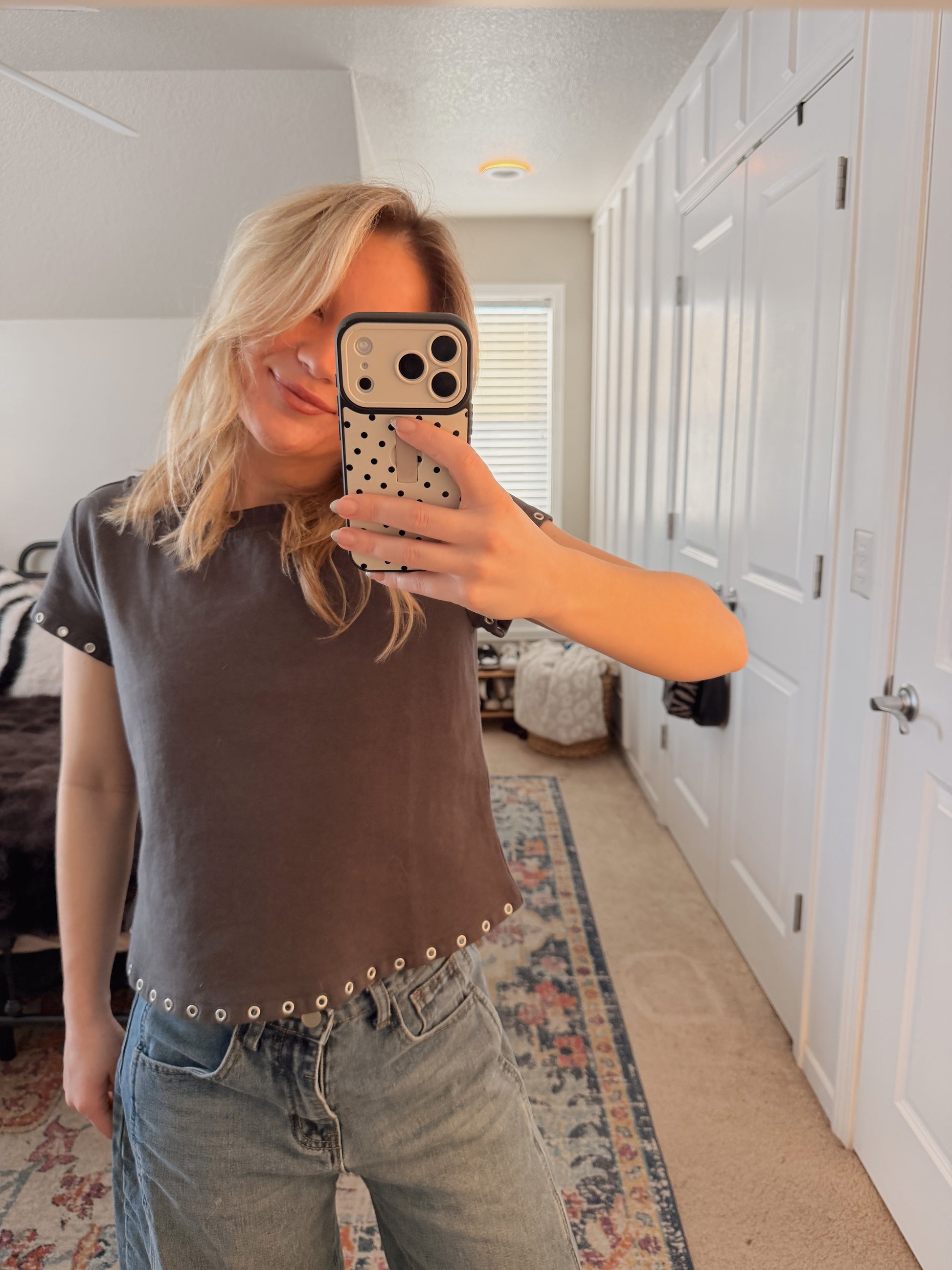 Eyelet detail boat neck short sleeve tee