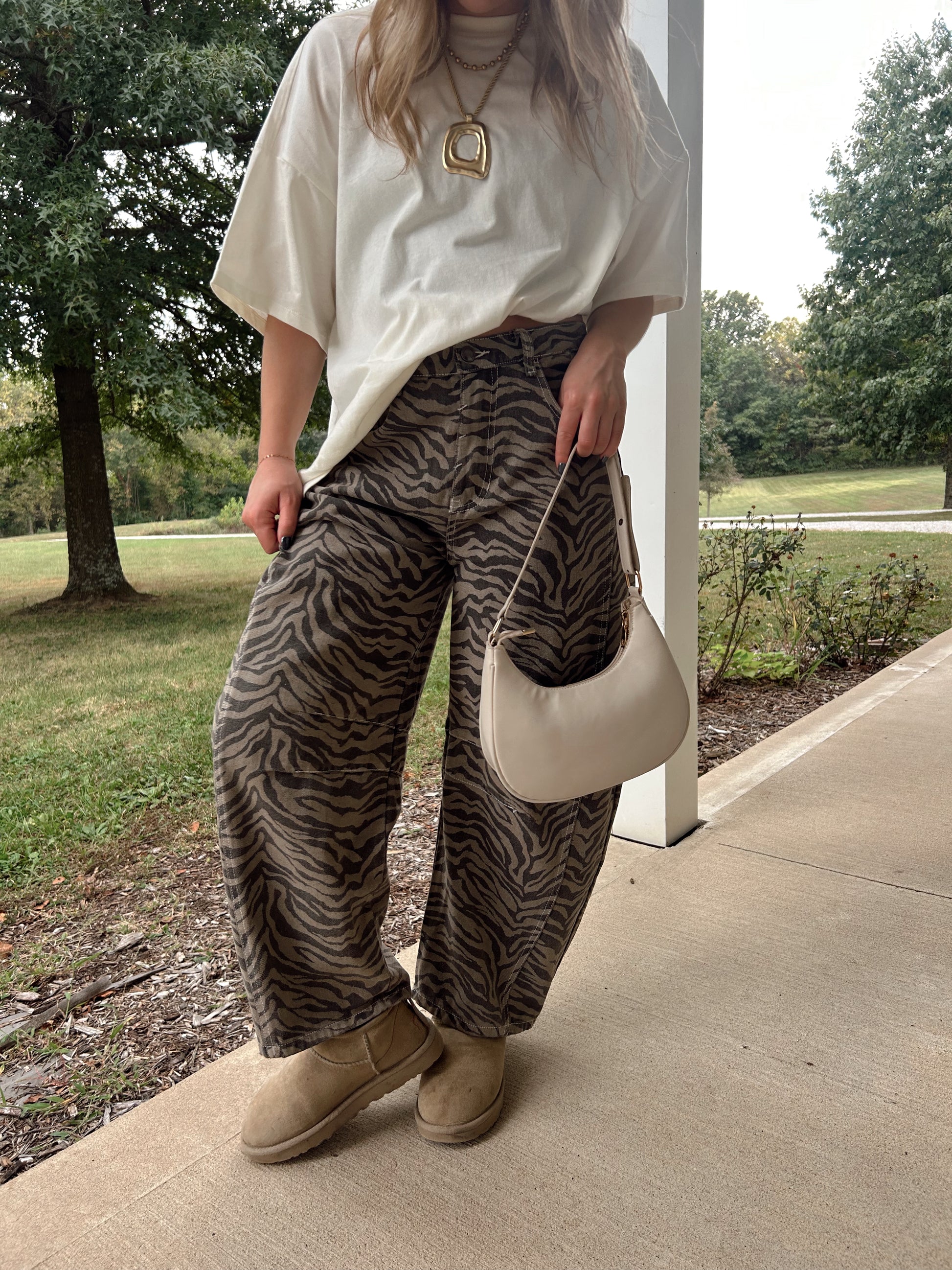 Zebra print relaxed fit barrel jeans.